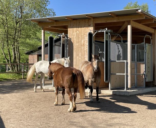 Fütterung (Heu, Stroh, Salzleckstein), Pflege der Offenstallanlage und der Weiden.